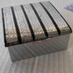 Cigarr cigarettask med asken i svart plast och locket i troligtvis nysilver Hollänskt inspirerat mäter 12.4 x8 cm och är 2.7 cm hög. Är ett arv. Se bilderna