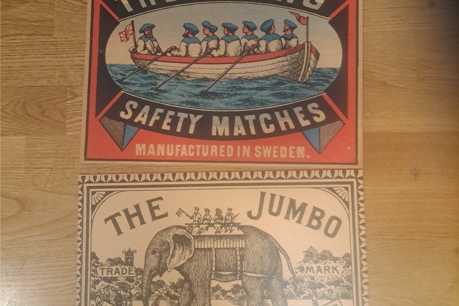 Två tändsticktryck etiketter med motiv. Den ena etiketten har ett motiv av en roddbåt och texten "The Rowing Safety Matches Manufactured in Sweden". Den andra etiketten har ett motiv av en elefant och texten "The Jumbo Safety Matches Impregnated These Matches are made in Sweden".