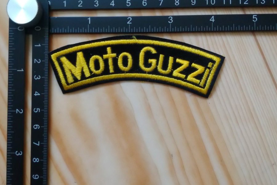 Ett broderat märke med texten "Moto Guzzi" i gult på svart botten. Märket är böjt och har en gul kant.