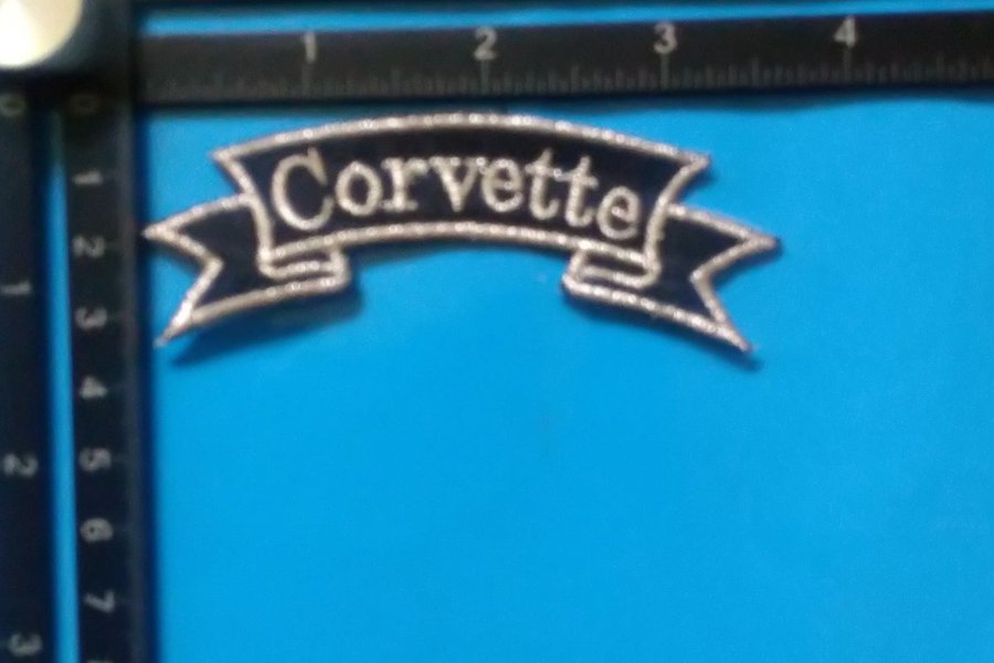 Ett Corvette-märke med en svart bakgrund och silverfärgad text och konturer. Märket har en banderollform.