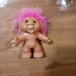 Retro Dam trold fra 1986 med pink hår. Den er mærket 'DAM 1986' og 'Made in China' under fødderne.