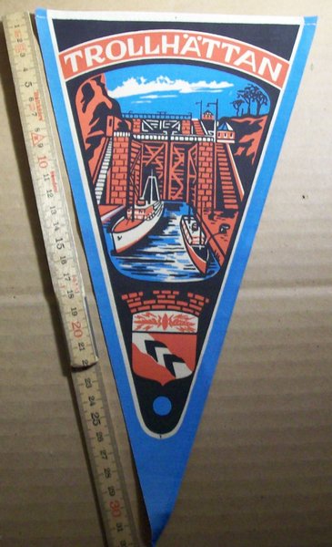 En vimpel från Trollhättan med motiv av slussarna och stadens vapen.
