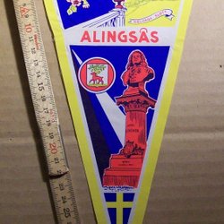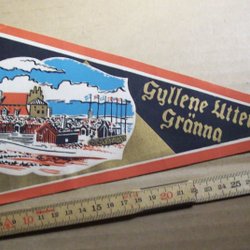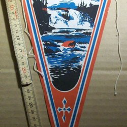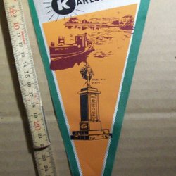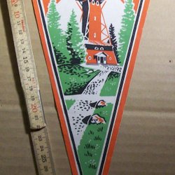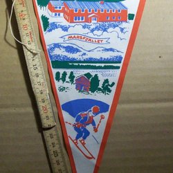 En retro vimpel från Oslo med motiv av Holmenkollen, Kon-Tiki och Rådhuset. Perfekt för samlaren eller som en dekorativ detalj.
