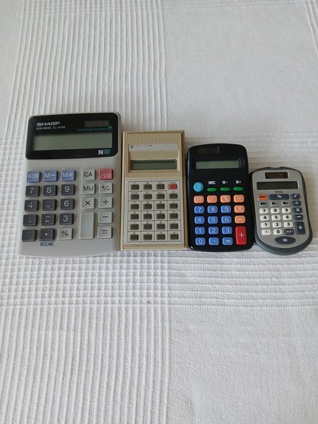 Fyra räknare av olika modeller. Inkluderar en Sharp ELSI Mate EL-354M, en Lyreco räknare och två andra.