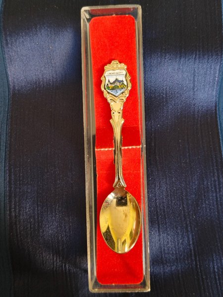 Samlarsked med motiv av Läckö Slott. Skeden är förpackad i en transparent plastask med röd insida.