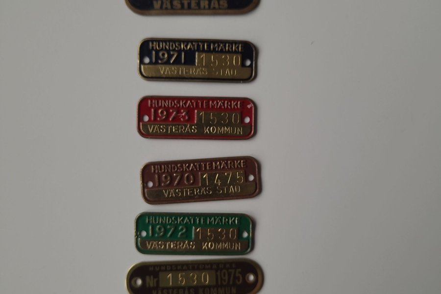 Föremålen på bilden är hundskattemärken från Västerås, utfärdade mellan 1930 och 1975.