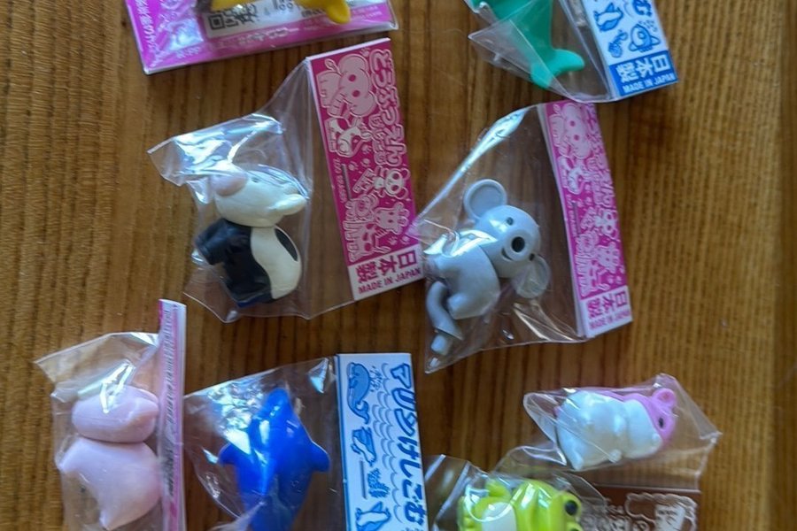 Samling av japanska suddgummin i form av djur. Varje suddgummi är förpackat i sin originalförpackning.