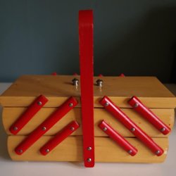Ett litet roligt och gulligt retro syskrin. Fint som prydnad i ett barnrum eller till någon som samlar. Fint skick för sin ålder. l18xb8,5xh7,5 + handtag höjd 15cm
