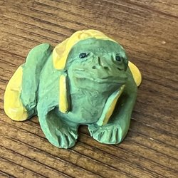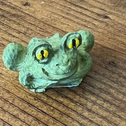 En uppvridningsbar leksaksgroda märkt Yone. Den är grön med gula detaljer och har en gul bas med fötter.