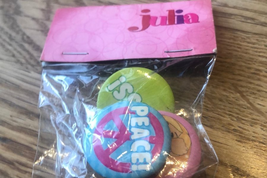 Detta är ett paket med tre knappar från Julia. En knapp är ljusgrön med texten ”is!”, en är ljusblå med en fredssymbol och texten ”PEACE”, och en är rosa med en tecknad figur. Knapparna är förpackade i en plastpåse med en rosa pappersetikett.