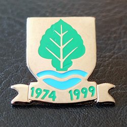 En äldre emaljerad brosch av guldfärgad metall och röd emalj. Statens Järnvägar:s bevingade hjul av 1944 års modell. Fästnål på baksidan.