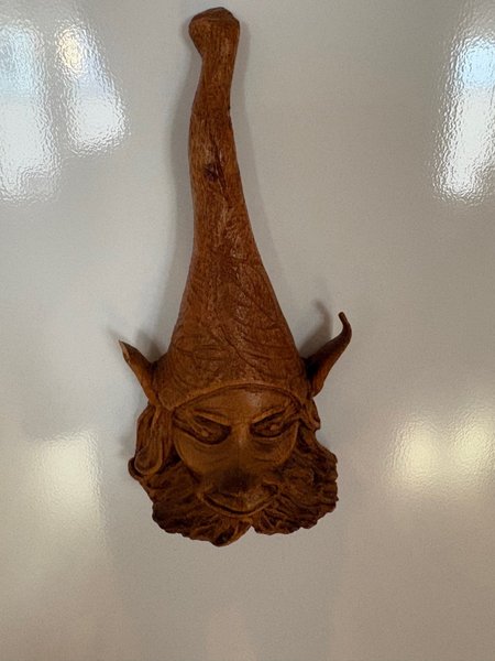 Träfigur i form av ett troll med lång mössa och skägg. kylskåpsmagnet