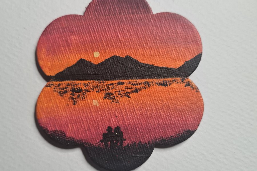 Tunn canvas med magnetisk baksida som kan håller papper vid kylskåpet målat med akrylfärg i form av en blomma.