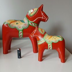 2 st dalahästar ena är märkt 'Nils olsson hemslöjd ab'