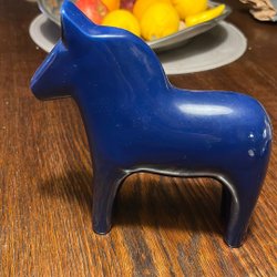 Det har lekts en del med hästen, och som fotona visar har den charmiga färgskav, men är i övrigt i bra skick.
