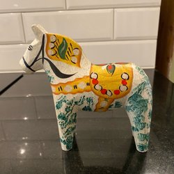 En klassisk dalahäst i trä. Handmålad med traditionella mönster. Ett av min mammas gamla loppisfynd. Se bilder för skick och storlek.