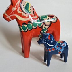 Två röda dalahästar i trä. Den större hästen är 14 cm hög och 13 cm lång. Den mindre hästen är 10 cm hög och 10 cm lång.
