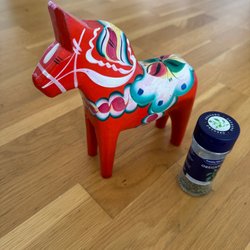 Blå dalahäst, 20 cm hög totalt. Kryddburk för jämförelse. Skick enligt bilder.