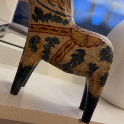 Trähäst, en klassisk svensk souvenir och dekoration. Denna häst är tillverkad i trä och har en enkel, stilren design.Häjd från örat 15 cm