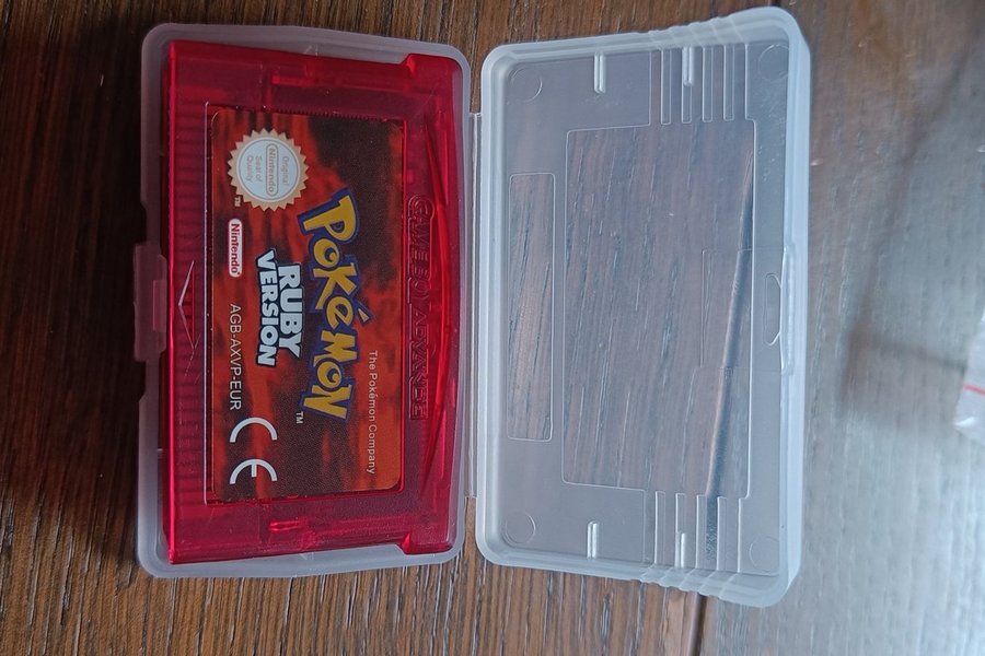 Spillet Pokémon Ruby Version til Game Boy Advance. Indeholder spilkasette og et beskyttelsesetui.