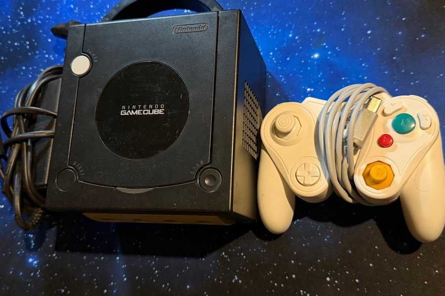 Detta objekt inkluderar en Nintendo GameCube konsol i svart färg. En handkontroll i vit färg medföljer.