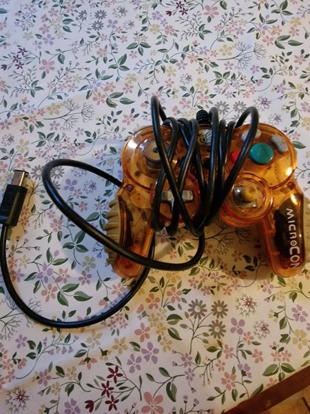 MicroCon GameCube-kontroll i transparent orange design. Kontrollen har en ansluten kabel med en GameCube-kompatibel kontakt.