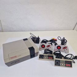 Säljer ett fullt fungerande Nintendo Entertainment System (NES), europeisk version. Inkluderar en 31-i-1 spelkassett, Super Mario Bros spelkassett, 5stycken handkontroller varav att 1st har avskavd plast och är lite trög och använda, en joystick och en NES Zapper dock så saknas original kartongerna O.B.S ALLT SÄLJES I BEFINTLIG SKICK