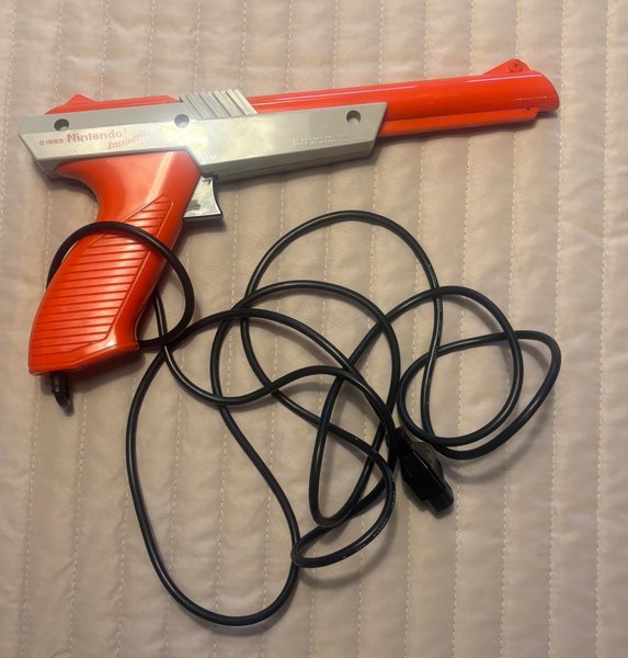 Nintendo Zapper, modellnummer NES-005. Tillverkad i Japan. ©1985 Nintendo Zapper.