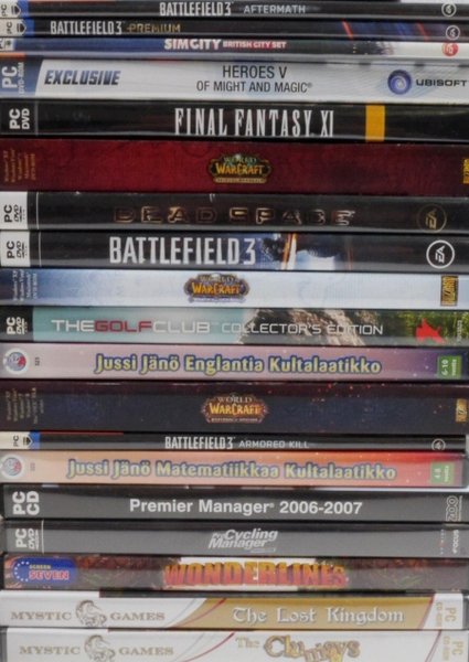 PC Games Bundle 4 includes following titles: Battlefield 3Battlefield 3 PremiumBattlefield 3: AftermathBattlefield 3: Armored KillDeadspaceFinal Fantasy XI Online Starter PackHeroes Of Mighty And Magic VJussi jänö englantiaJussi jänö matematiikkaPremier Manager 2006-2007Pro Cycling ManagerSimcity: British City SetThe ClumsysThe Golfclub Collectors EditionThe Lost KingdomWonderlinesWorld Of Warcraft: Gme DVD Disc 2World Of Warcraft: Mist Of PandariaWorld Of Warcraft: Warlords Of DreanorWorld Of Warcraft: Wrath Of Lich King