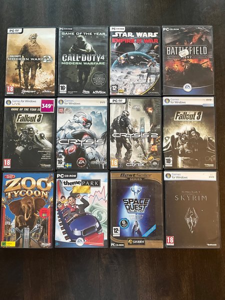 Säljer en samling PC-spel. Inkluderar titlar som Call of Duty, Battlefield 1942, Fallout 3, Crysis, Zoo Tycoon, Theme Park Inc, Star Wars, Space Quest Collection och Skyrim.