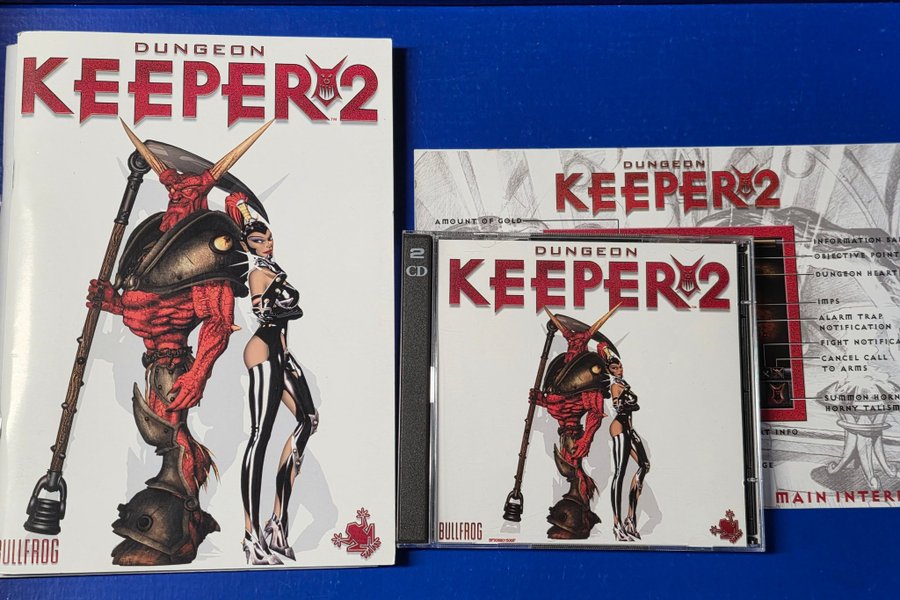 Dungeon Keeper 2 PC CD-ROM från Bullfrog. Spelet levereras i ett CD-fodral och innehåller 2 skivor.