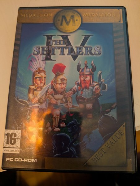 The Settlers IV för PC CD-ROM. Spelet har en åldersgräns på 16+ enligt PEGI.
