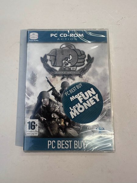 Hidden & Dangerous PC CD-ROM. Spelet är ett actionspel och kommer på 3 CD-ROM-skivor. Rekommenderad ålder är 16+ enligt PEGI.