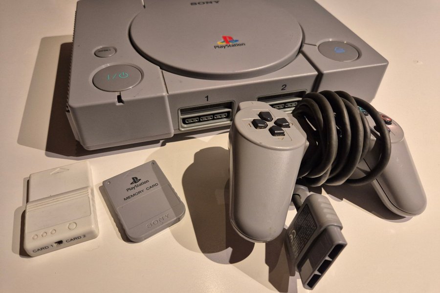 Sony Playstation med en handkontroll och två minneskort. Ingen bildkabel, endast strömkabel. Startar och går. Men eftersom bildkabel saknas så kan jag ej garantera funktion (den funkade innan den packades ner för förvaring cirka 10år sedan).