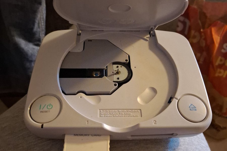 Sony PlayStation 1 konsol. Konsolen har en minneskortplats och knappar för ström/återställning och skivöppning. Texten "NEVER TOUCH THE LENS" finns vid skivläsaren.