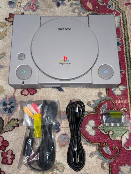 Sony PlayStation konsol med strömkabel och AV-kabel. En TV-adapter medföljer.