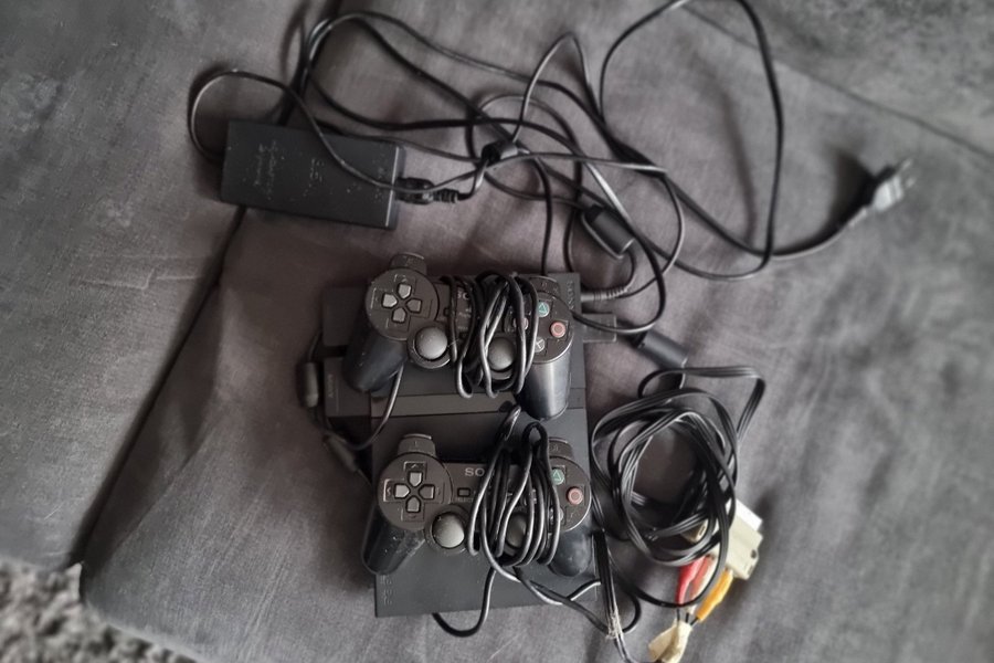 Playstation 2 konsol med två handkontroller. Strömkabel och AV-kabel ingår. Samt 2 minneskort