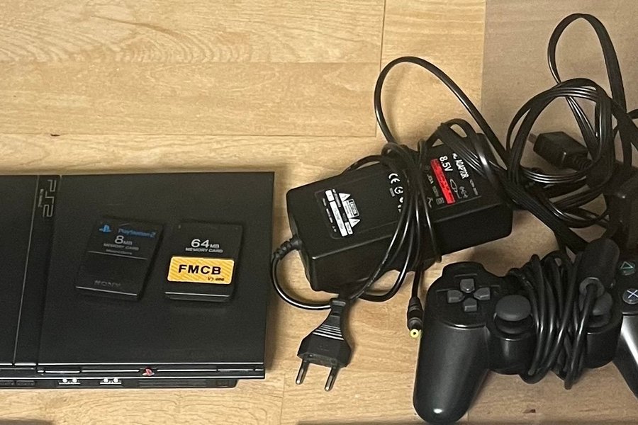 Playstation 2 slim konsol med en controller. Der medfølger to memory cards, et 8MB og et 64MB FMCB. Desuden medfølger et PS2 til HDMI stik.