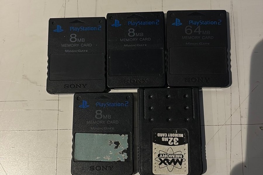 Ett urval av minneskort till Playstation 2. Inkluderar 8MB, 32MB och 64MB minneskort.
