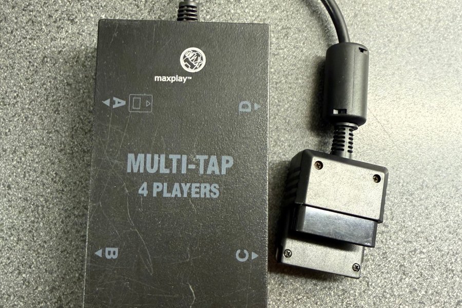 En Maxplay Multi-Tap för att ansluta upp till fyra spelare. Kompatibel med konsoler som använder denna typ av anslutning.