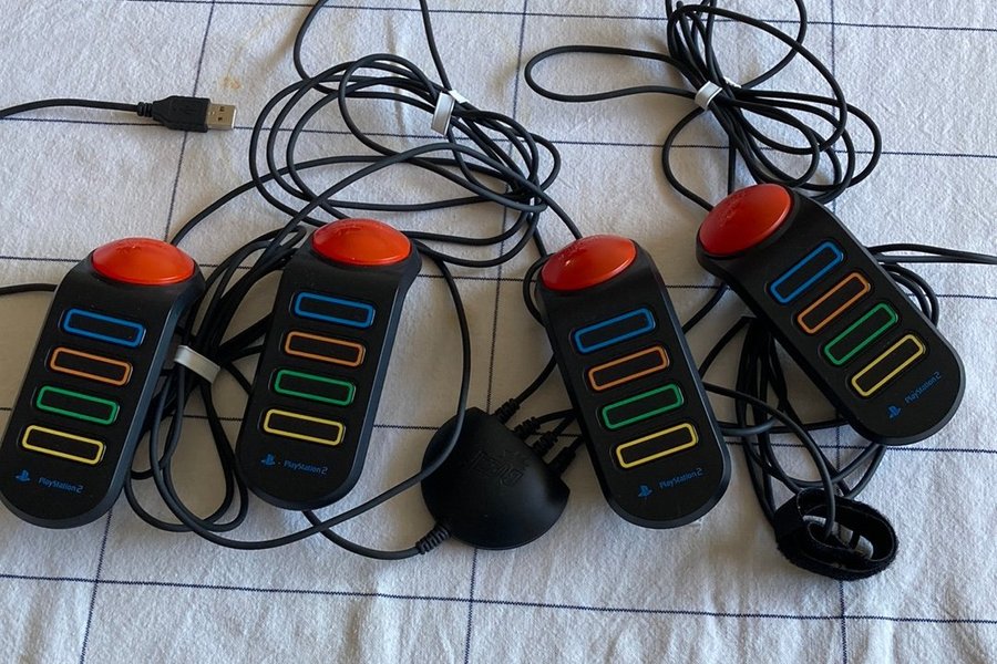 Fyra Buzz! kontroller för PlayStation 2. Varje handkontroll har en stor röd knapp och fyra mindre knappar i blått, orange, grönt och gult. Kontrollerna ansluts via USB.