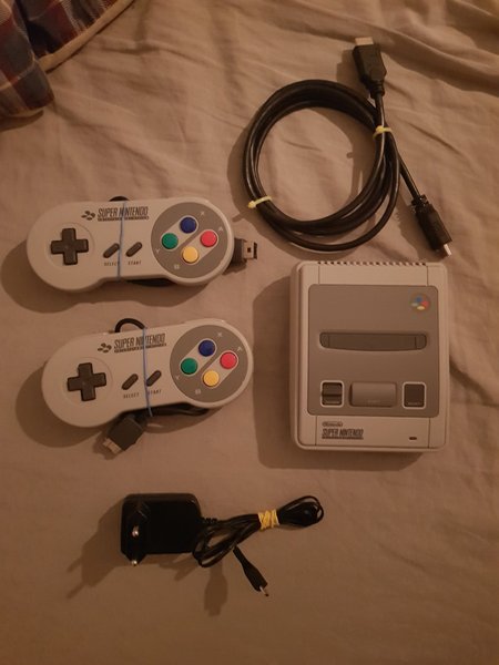 Super Nintendo Classic Mini konsol med två handkontroller. Konsolen är en miniatyrversion av den klassiska Super Nintendo Entertainment System. Den ansluts till TV:n via HDMI-kabel. Strömadapter medföljer. Nytt skick