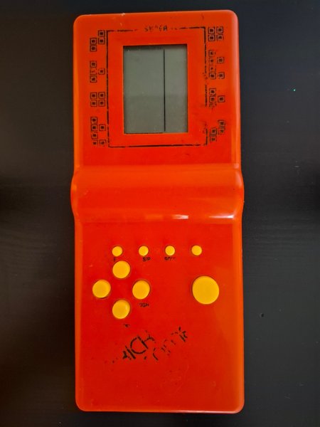 Handhållet spel i orange färg. Spelet har gula knappar och en monokrom skärm.