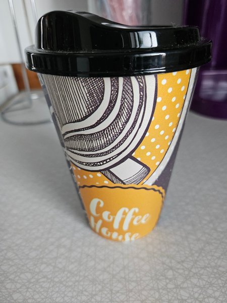 En take away mugg när man är på språng för förvaring av kaffe eller te. Muggen är av plast. Helt ny oanvänd.