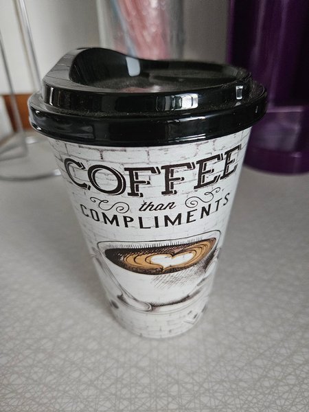 En take away mugg med motiv av en cappuccino kopp. Muggen är oanvänd och är av plast, perfekt som en inredning detalj i hemmet eller när man är på språng