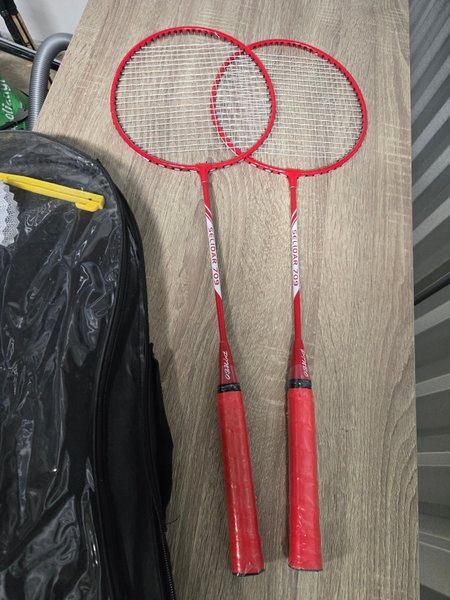 Ett 2-pack badmintonracketar av modellen Selidar 709. Racketarna är röda med vita strängar och har röda grepp. Ett svart fodral medföljer.