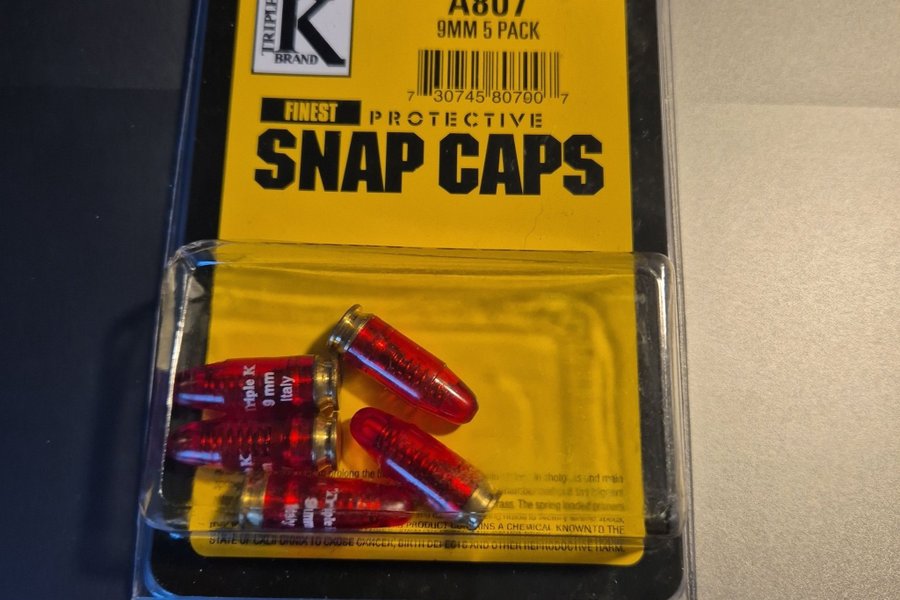 Detta är ett paket med 5 stycken snap caps i 9mm. Används för träning och säkerhet. Perfekt för att öva avtryck och hantering av vapen.