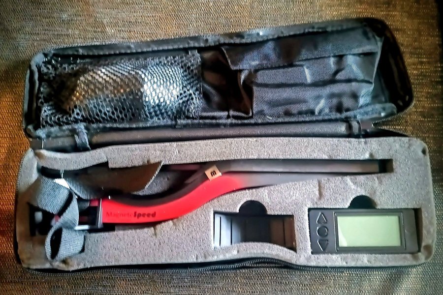 MagnetoSpeed V3 kronograf i originalväska. Inkluderar en displayenhet, bajonettsensor, tjocka och tunna distanser, fästremmar, stång, gummerade V-block, och en robust förvaringsväska.