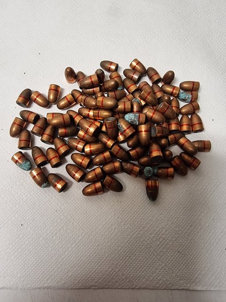 100 stycken kulor 7 gram 9mm dragna ur patron finns märken efter utdragning på en del även missfärgning finns även berdan hylsor om intresse finns bara höra av sig