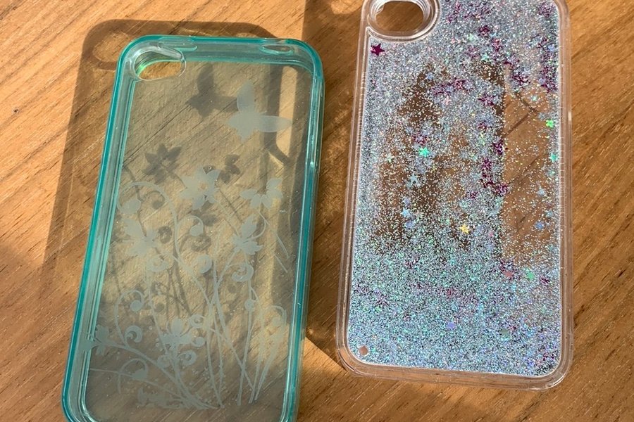Två iPhone-skal. Ett turkosfärgat skal med fjärils- och blommotiv. Ett transparent skal med glitter och stjärnor.